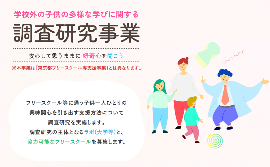 「学校外の子供の多様な学びに関する調査研究事業」では、フリースクール等に通う子供一人ひとりの興味関心を引き出す支援方法について、大学等の機関やフリースクール等と連携しながら、調査研究を実施します。