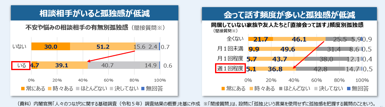また、孤独や孤立に関する調査では、孤独感は、相談相手がいることや直接会って話す頻度が多いことにより、低く抑えられることが示唆されています。