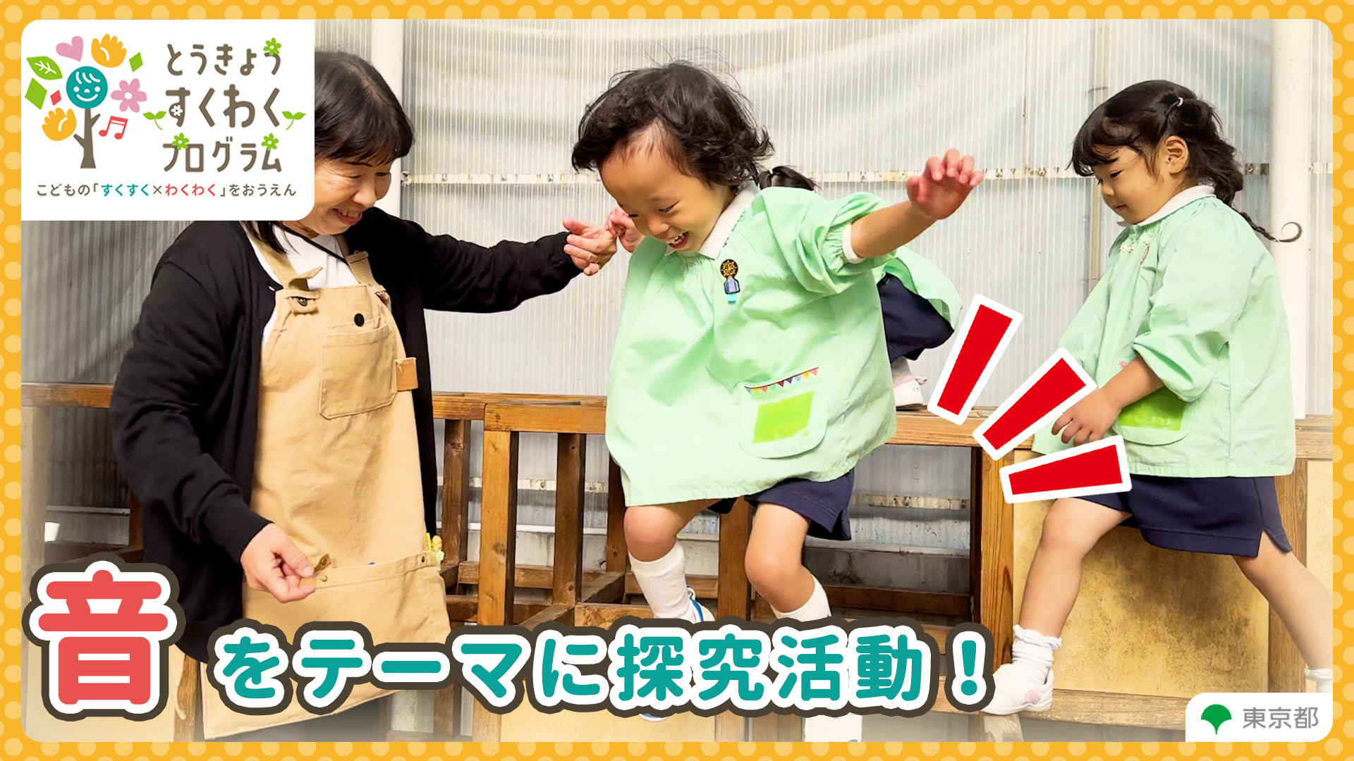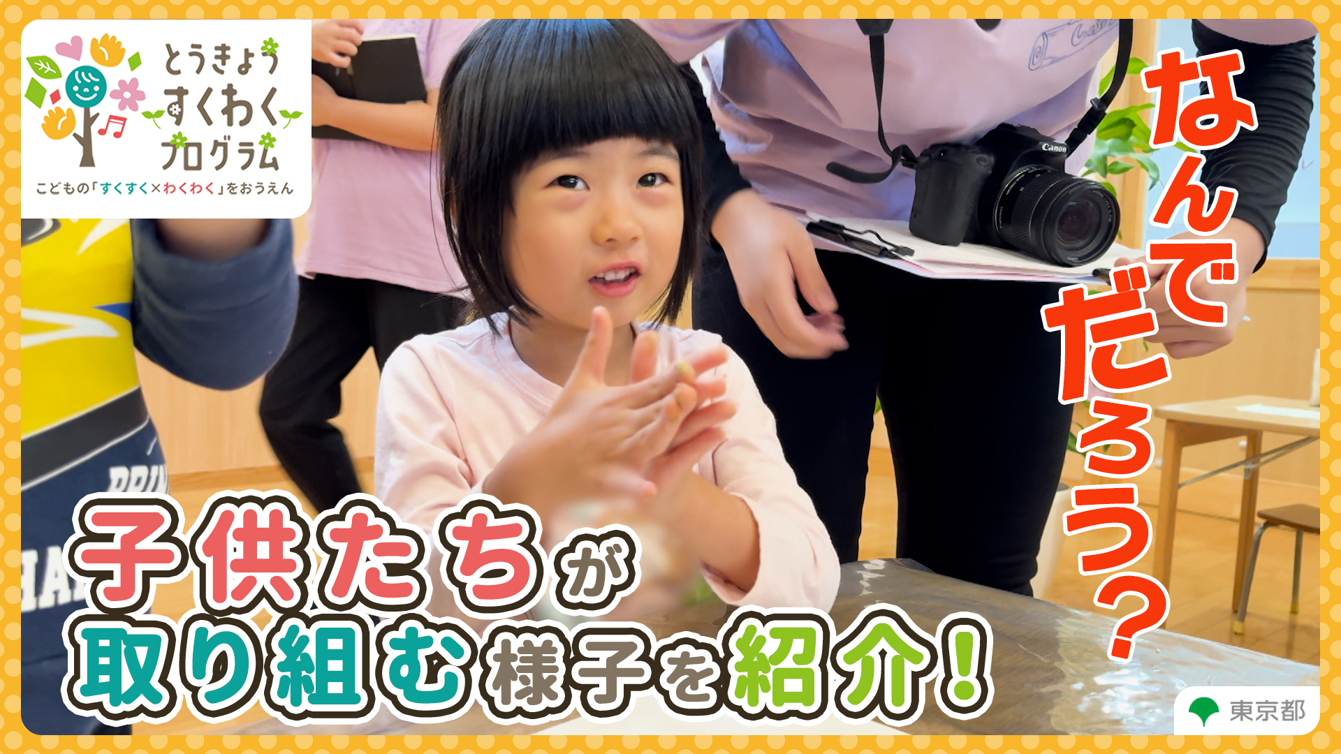本事業は、「とうきょう すくわくプログラム」に基づき、幼稚園や保育所といった施設類型の垣根を越え、各園の環境や強みを活かしながら、各園が設定するテーマに沿って、乳幼児の興味・関心に応じた探究活動を実践する幼稚園・保育所等を支援することにより、幼児教育・ 保育の充実を図ることを目的としています。