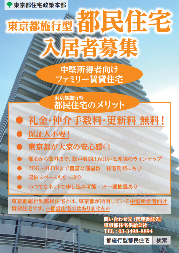 東京都が所有している中堅所得者向けファミリー賃貸住宅で、随時募集しております。